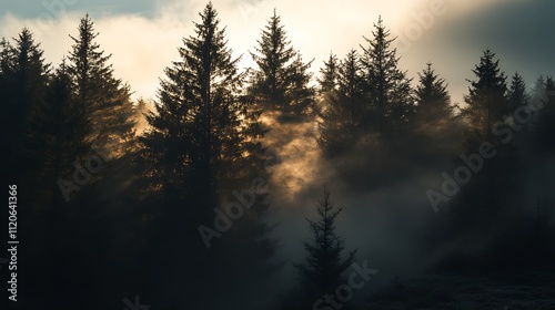 Golden Sunrise Through Pine Trees with Cloudy Mist in Enchanting Forest : Generative AI
