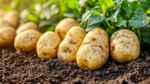 Golden sunset casts warm light over a lush potato field, with freshly harvested potatoes in the foreground, symbolizing abundance, hard work, and the beauty of sustainable agriculture.