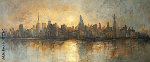 Golden sunset over a cityscape reflected in calm water.