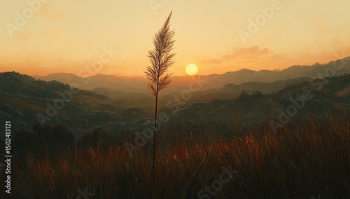 Golden sunset over a mountain range, with a single grass stalk in the foreground