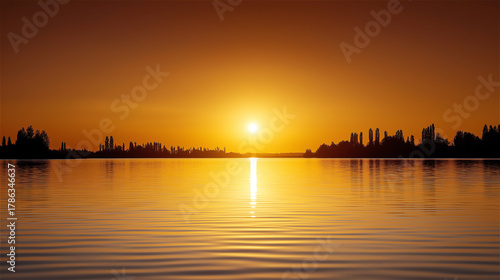 Golden sunset over calm lake reflecting orange sky and distant trees, concept of peace, nature, and mindfulness.