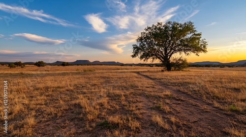 Golden sunset over dry grassland with a solitary tree casting shadows on the warm earth : Generative AI