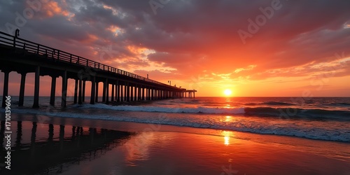 Golden sunset pier over tranquil sea