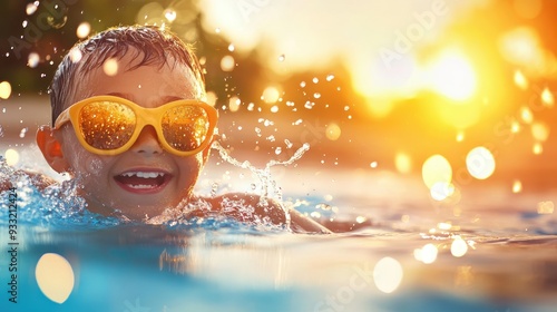 Golden Sunset Swim - End of Summer Celebration with Watercolor Splashes and Vibrant Light Reflections