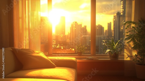 Golden sunset view from a cozy living room