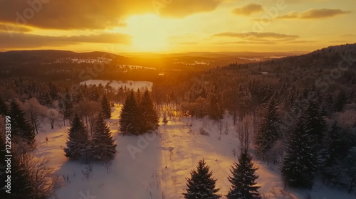 Golden Sunset Winter Forest Aerial View Snowy Landscape Sky Cold Pine Wood Trees White Nature Season