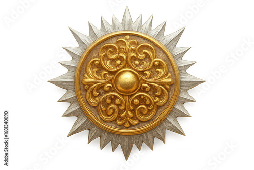 Golden sun-shaped ornament with floral decoration isolated on transparent background, creating a luxurious and elegant design element