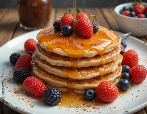 Golden Syrup Drizzled Buttermilk Pancakes with Fresh Berries