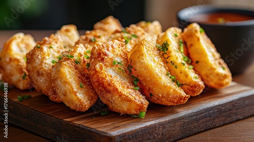 Golden tempura empanadas on rustic wooden table side lighting enhancing crunchiness realistic food photography