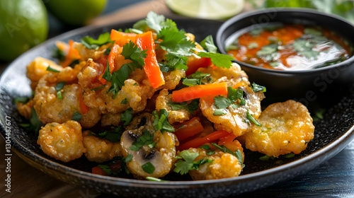 Golden tempura vegetables with carrots, bell peppers, and mushrooms, served with a spicy lime dipping sauce and garnished with fresh cilantro.