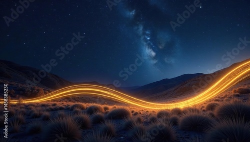 Golden trails streak across a dark canvas, distant stars twinkle, golden, twinkle, dark