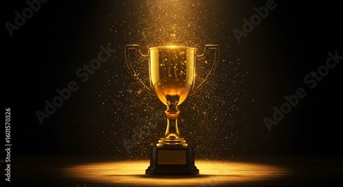 Golden Trophy Award with Sparkling Particles on Dark Background for Victory and Success Concept in Business or Sports Achieving Goals and Recognition