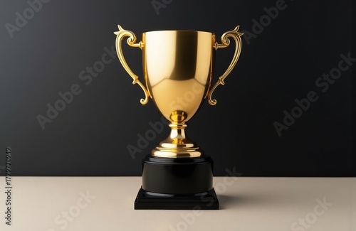 Golden trophy cup with ornate handles on a black base against a dark background