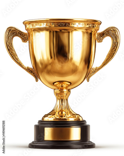 Golden Trophy of Triumph: An elegant golden trophy sits prominently against a clear backdrop, radiating brilliance and signifying success, victory, and accomplishment in a photorealistic setting.