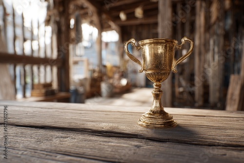 Golden trophy on rustic wooden table in a blurred background.