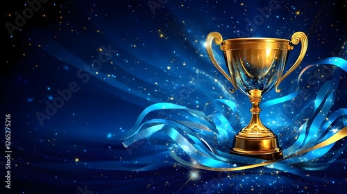 golden trophy prize with streamers on blue background representing award ceremony business leadership and corporate success