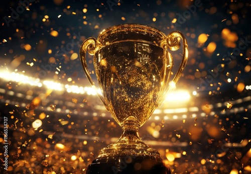 Golden Trophy Surrounded by Confetti in a Stadium Spotlight..