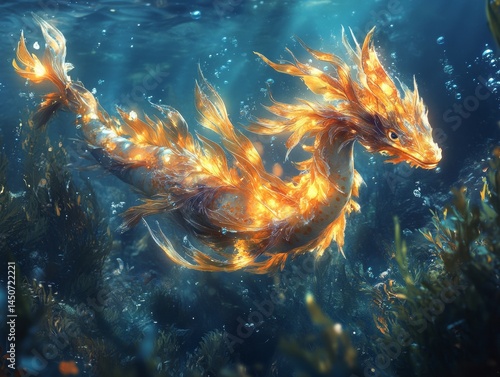 Golden Underwater Dragon: A Mythical Creature Swimming Through Azure Depths Amidst Seaweed and Bubbles, a Majestic Fusion of Legend and Marine Life.