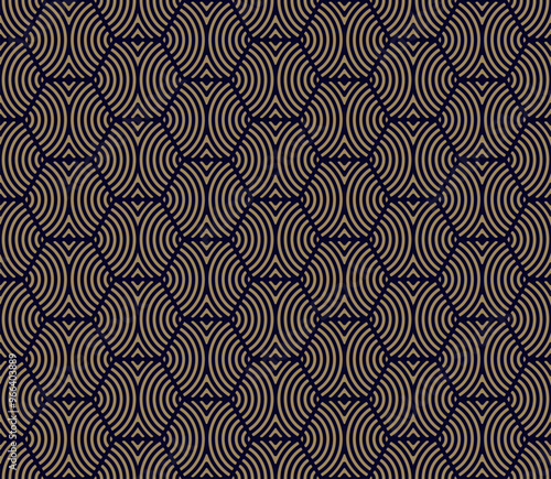 Golden vector abstract geometric pattern with hexagon shapes, curved lines, stripes, waves, stripes. Gold and black texture. Stylish modern minimalist background. Simple repeated decorative geo design