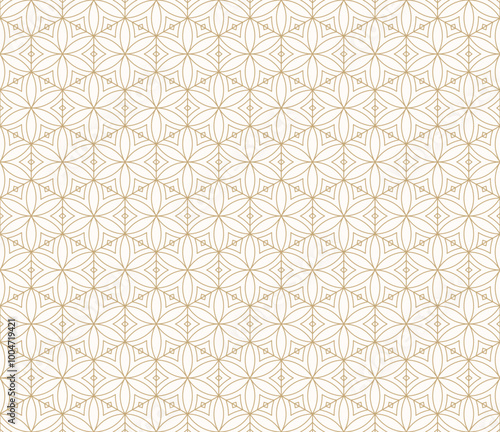 Golden vector geometric seamless pattern with floral silhouettes, leaves, hexagonal grid, thin curved lines. Gold and white abstract texture. Subtle minimal background. Repeated design in asian style