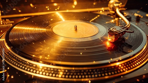 Golden vinyl record spinning on turntable with glowing reflections of warm light and vintage stylus