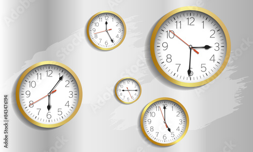 Golden wall office clock set with different times , Mock-up for branding and advertise isolated on white background , vector illustration design.