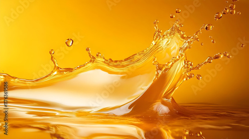 Golden water splash drop background, yellow food fresh poster, orange liquid beverage backdrop, splatter texture