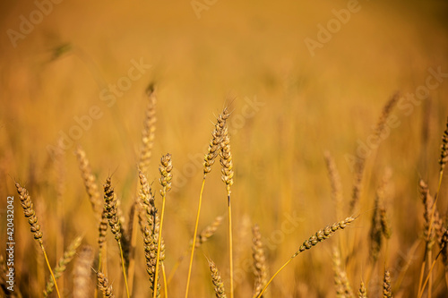 golden wheat field and sunny day Rural landscape. Beautiful natural scenery at sunset. Rich harvest.