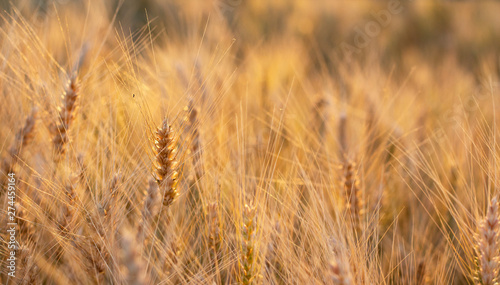 Golden wheat field at sunset with sun reflections in the spikelets of wheat. Beautiful harvest summer wheat. Future perfect healthy bread