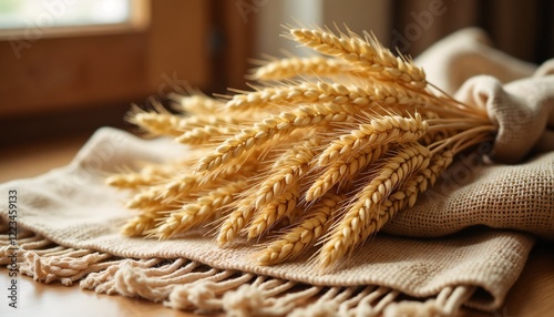 Golden wheat sheaf tied with burlap resting on soft fabric near a window