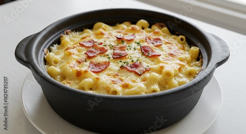 Golden-Brown Baked Macaroni with Bacon in a Rustic Black Bowl