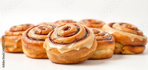 Golden-brown cinnamon buns, swirls visible, on pristine white , cinnamon buns, pastry