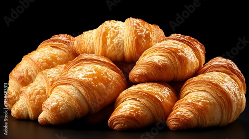 Golden-brown croissants piled high on dark surface