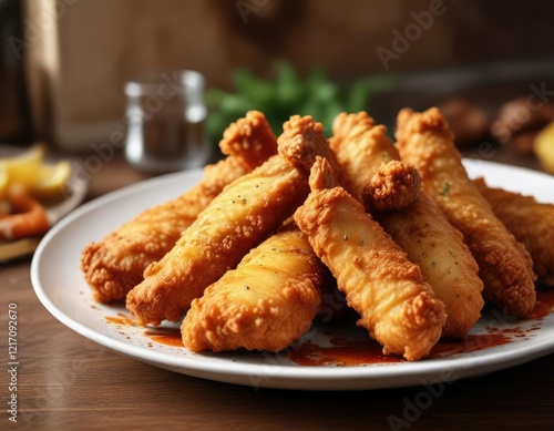 Golden-brown fried chicken tenders on a plate, tender, delicious