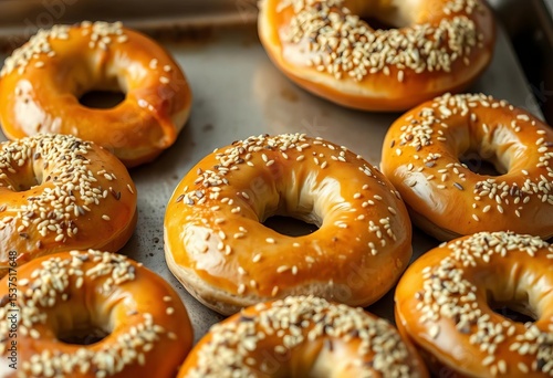 Golden-brown homemade sesame bagels, glistening with oil, arranged on a baking sheet, texture, baking
