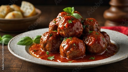 Golden-Brown Meatballs in Spicy Tomato Sauce: A Close-Up Top View of Juicy, Flavorful Comfort on a Rustic Table
