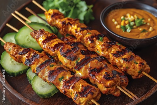 Golden-brown satay skewers with peanut sauce, rice cakes, and fresh herbs