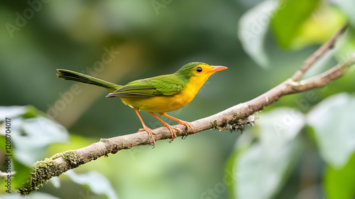 Golden-headed cisticola perched on branch, rainforest background, wildlife photography for nature documentaries