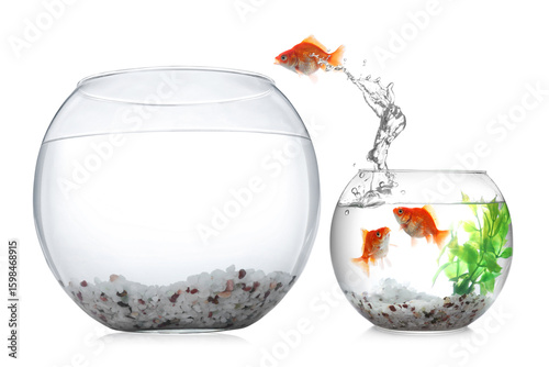 Goldfish jumping out of small glass bowl into bigger one against white background