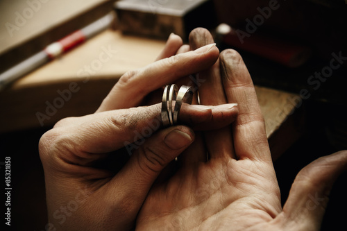 Goldsmith working on wedding rings, hand holding unfinished ring