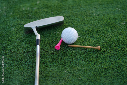 Golf ball and golf club on green in the evening golf course with sunshine.