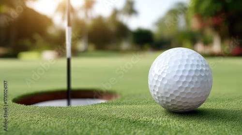 Golf ball close to hole on a sunny day in a lush green golf course during afternoon
