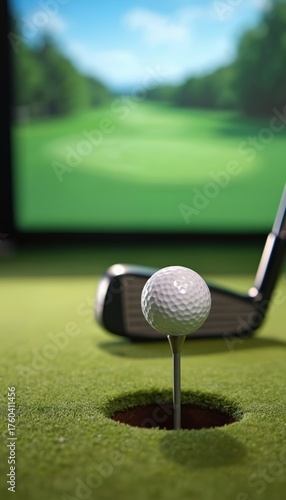 Golf ball on tee near hole with club ready to swing. Blurred green fairway background. Indoor golf simulator setup. Outdoor course simulation on screen.
