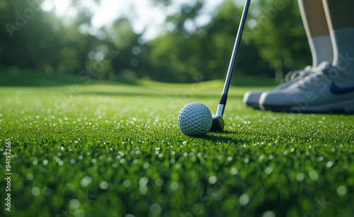 Golf club and ball on a green field.