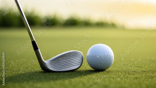 Golf club and golf ball on a green lawn in a beautiful golf course