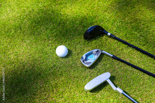 Golf clubs and ball lie on green grass in a rays of the everlasting sun. High quality photo