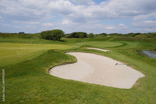 Golf course green with sand trap bunker. sport and leisure. Golfing landscape