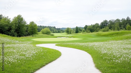 Golf course pathway winding through lush greenery