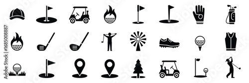Golf Icon Set – Black Silhouette Symbols for Equipment, Players, and Course Elements