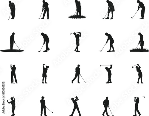 Golf player silhouette, swing motion, golfer action pose, sports vector art, black golf figures, putting, club holding
